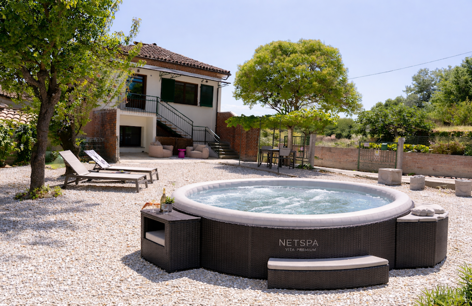Privé jacuzzi bij Casa di Mia Zia Bed & Wine. Misschien heb je een dorpje ontdekt, een wijn geproefd waar je spontaan verliefd op werd, of gewoon heerlijk een beetje geslenterd in de omgeving. Je loopt terug naar je vakantieverblijf, schenkt een glas wijn in… en stapt zo je eigen privé jacuzzi in. Geen reservering, geen andere gasten, geen gedoe. Alleen bubbels, in  warm water (afhankelijke van het seizoen) en een fantastisch uitzicht.